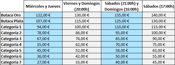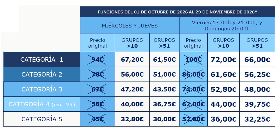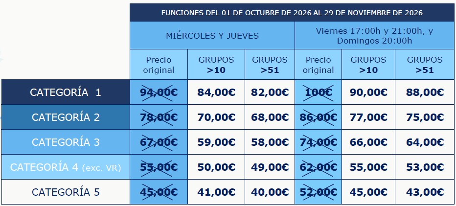 Precios especiales preventa: * HASTA UN 25% DE DESCUENTO *Estos precios especiales de preventa para grupos solo se aplicarán en grupos con entradas para funciones de octubre y noviembre de 2026, pagados antes del 31 de julio de 2026. Precios grupos: **Estos precios especiales para grupos se aplicarán en grupos con entradas para funciones de octubre y noviembre de 2026, pagados después del 31 de julio de 2026. Estos precios son válidos para reservas de grupos hasta el 30 de septiembre de 2026. El precio dependerá de las circunstancias del grupo y de la disponibilidad de las localidades. Precios de grupos para las funciones indicadas en cada tabla, excepto 4 y 5 de Diciembre, periodo del 23 de diciembre al 6 de enero y festivos locales y nacionales de 2026. Todos estos precios incluyen IVA y gastos de gestión. 1 gratuidad por cada 51 entradas de pago.